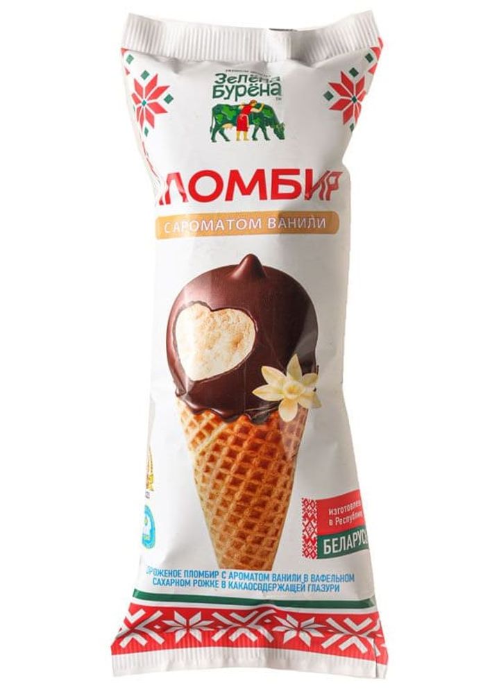 Мороженое "Пломбир с ароматом ванили" в вафельном сахарном рожке в какаосодержащей глазури 15% жирности.