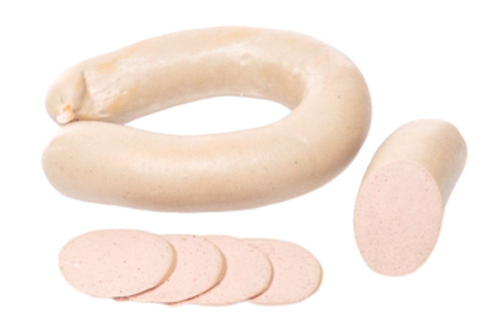 Состав: вода питьевая, шкурка вареная свиная, соеденительная ткань и хрящи от жиловки говядины, печень свиная жилованная, жир-сырец свиной бланшированный, крупа манная, лук пассерованный, соль поваренная пищевая йодированная, комплексная пищевая добавка для мясной продукции с йодом, экстракты овощей и специй.