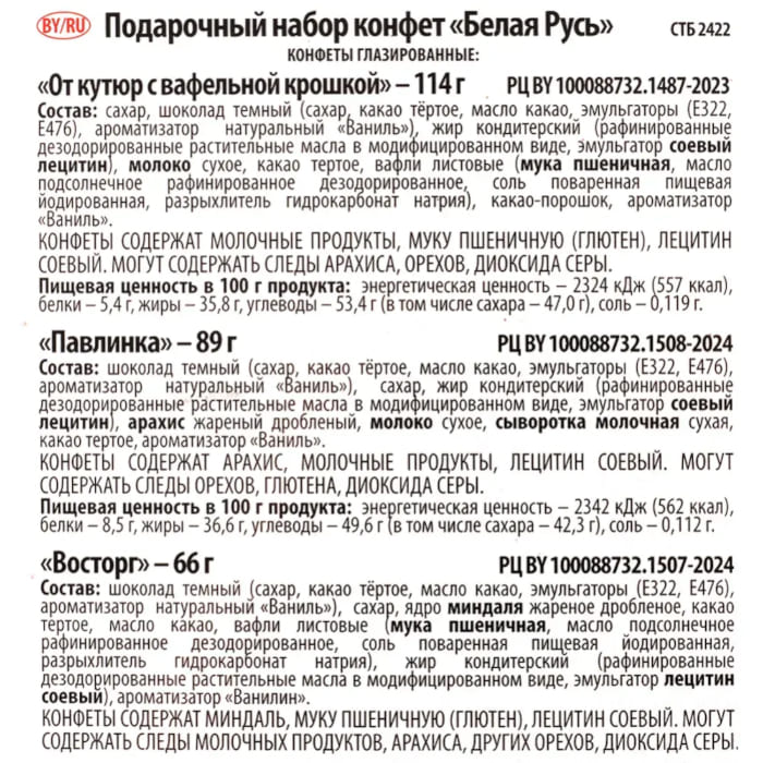 Состав: "От кутюр с вафельной крошкой": сахар, шоколад темный (сахар, какао тёртое, масло какао, эмульгаторы (Е322, Е476), ароматизатор натуральный "Ваниль"), жир кондитерский (рафинированные дезодорированные растительные масла в модифицированном виде, эмульгатор соевыйлецитин), молоко сухое, какао тертое, вафли листовые (мука пшеничная, масло подсолнечное рафинированное дезодорированное, соль поваренная пищевая йодированная, разрыхлитель гидрокарбонат натрия), какао-порошок, ароматизатор «Ваниль». «Павлинка»: шоколад темный (сахар, какао тёртое, масло какао, эмульгаторы (Е322, Е476), ароматизатор натуральный "Ваниль"), сахар, жир кондитерский (рафинированные дезодорированные растительные масла в модифицированном виде, эмульгатор соевыйлецитин), арахис жареный дробленый, молокосухое, сыворотка молочная сухая, какао тертое, ароматизатор "Ваниль». "Восторг" : шоколад темный (сахар, какао тёртое, масло какао, эмульгаторы (E322, Е476), ароматизатор натуральный "Ваниль"), сахар, ядро миндаля жареное дробленое, какао тертое, масло какао, вафли листовые (мука пшеничная, масло подсолнечное рафинированное дезодорированное, соль поваренная пищевая йодированная, разрыхлитель гидрокарбонат натрия), жир кондитерский (рафинированные дезодорированные растительные масла в модифицированном виде, эмульгатор лецитин соевый), ароматизатор "Ванилин". "Маленькая волшебница": шоколад темный (сахар, какао тёртое, масло какао, эмульгаторы (Е322, Е476), ароматизатор натуральный "Ваниль"), сахар, арахис жареный дробленый, масло какао, вафли листовые (мука пшеничная, масло подсолнечное рафинированное дезодорированное, соль поваренная пищевая йодированная, разрыхлитель гидрокарбонат натрия), жир кондитерский (рафинированные дезодорированные растительные масла в модифицированном виде, эмульгатор соевый лецитин), сливки сухие, сыворотка молочная сухая, ароматизатор "Ванилин".