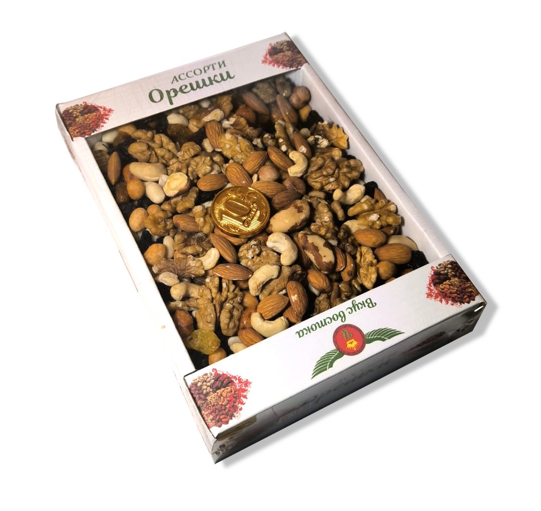 Состав: кешью, миндаль, бразильский орех, фундук, грецкий орех, арахис, изюм светлый, изюм темный.