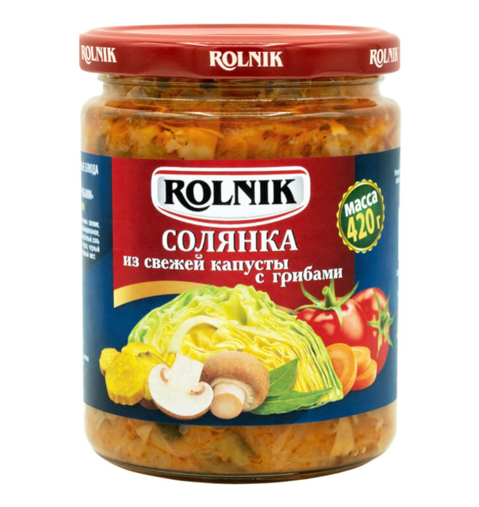 Состав: капуста свежая, грибы шампиньоны свежие, огурцы соленые, масло подсолнечное рафинированное, лук репчатый свежий, томатная паста, сахар белый, соль пищевая выварочная йодированная, перец чёрный молотый, перец душистый молотый, лавровый лист.