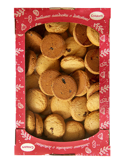Состав: сахар, мука пшеничная первого сорта, мука овсяная, маргарин (масла растительные рафинированные дезодорированные, вода, соль пищевая поваренная йодированная (агент антислеживающий: ферроцианид калия), сыворотка молочная сухая, эмульгаторы (лецитин соевый, моно- и диглицериды жирных кислот, антиокислитель: кислота лимонная),сахар, консервант: сорбат калия, краситель: бета-каротин, ароматизатор, антиокислитель: концентрат смеси токоферолов), изюм (консервант диоксид серы), разрыхлители (гидрокарбонат натрия, гидрокарбонат аммония), соль поваренная пищевая йодированная (йодат калия, агент антислеживающий ферроцианид калия), корица молотая, ароматизатор «Ванилин». Может содержать следы арахиса, кунжута, орехов.