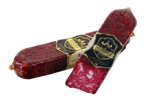 Состав: свинина, говядина, посолочно-нитритная смесь (соль пищевая, стабилизатор цвета - нитрит натрия, агент антислеживающий - ферроцианид калия), пищевые добавки (экстракты специй (перец чили, чеснок, черный перец), сахароза, соль пищевая, консервант - нитрат калия, антиокислитель - аскорбат натрия, усилитель вкуса и аомата - глутамат натрия, специи - перец чили, кориандр, тмин, паприка, черный перец, горчица), чеснок сушеный, стартовая культура.