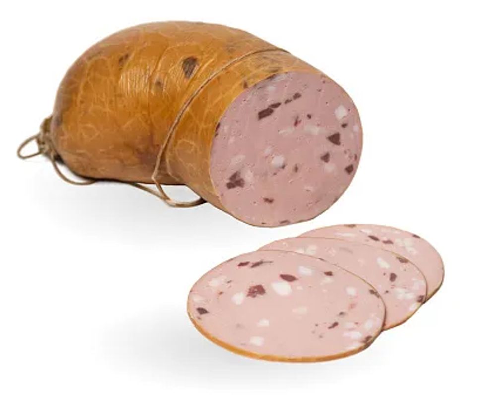 Состав: свинина, вода, сердце говяжье или свиное, шпик, говядина. шкурка свиная, молочная сыворотка, комплексная пищевая добавка для мясной продукции с йодом, специи.