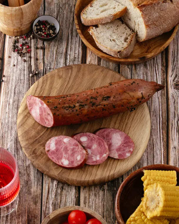 Состав продукта: говядина, свинина, вода питьевая, шпик боковой, комплексная пищевая добавка, специи и экстракты специй.